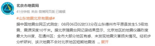 据中国地震台网正式测定:8月6日2时33分在山东德州市平原县发生5.5级地震,震源深度10千米。据北京强震台网记录结果显示,北京地区的地震仪器烈度最大为III度,在通州区;全市大部分地区有感,未发现地震灾害损失情况。