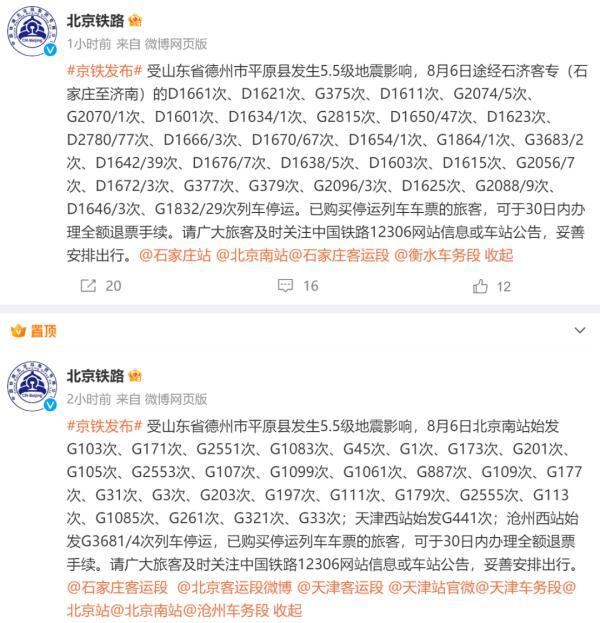 据@北京铁路消息,受山东省德州市平原县发生5.5级地震影响,8月6日途经石济客专(石家庄至济南)的D1661次、D1621次、G375次、D1611次、G2074/5次、G2070/1次、D1601次、D1634/1次、G2815次、D1650/47次、D1623次、D2780/77次、D1666/3次、D1670/67次、D1654/1次、G1864/1次、G3683/2次、D1642/39次、D1676/7次、D1638/5次、D1603次、D1615次、G2056/7次、D1672/3次、G377次、G379次、G2096/3次、D1625次、G2088/9次、D1646/3次、G1832/29次列车停运。已购买停运列车车票的旅客,可于30日内办理全额退票手续。请广大旅客及时关注中国铁路12306网站信息或车站公告,妥善安排出行。