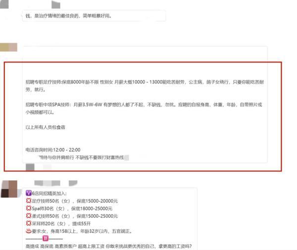 如“花式”指色情服务,“新茶”指店内新来的女技师,“小”“中”“大”指代的则是色情服务的不同程度。业务逐渐“成熟”后,前台还在各种聊天群中大肆招聘女技师,“SPA技师月薪3.5-6W,有梦想的人都了不起,不缺钱,勿扰。”