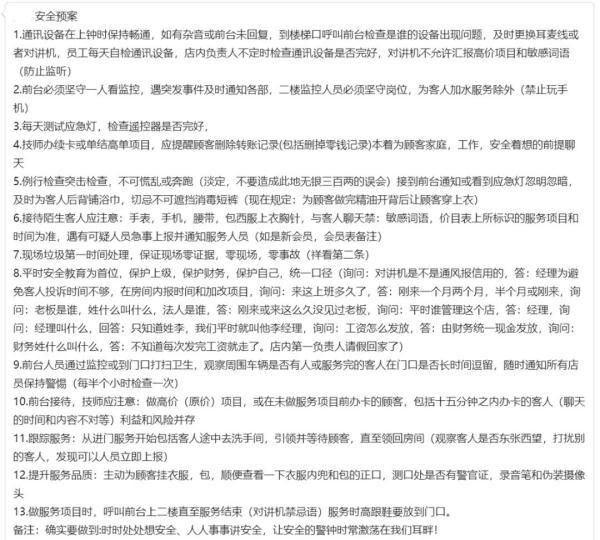 为确保能逃避查处,全店还制定了13条严密的“安全预案”:在门店内外多处加装高清监控探头、特定时期采取关灯营业或暂停营业的“策略”、注重审查客人的“安全系数”、培训SPA技师的反侦查手段、通过网络关注公安机关的打击动向……