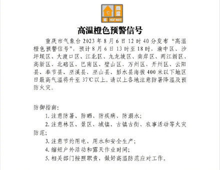 重庆市气象台8月6日12时40分发布“高温橙色预警信号”。预计8月6日13时至18时,渝中区、沙坪坝区、大渡口区、江北区、九龙坡区、南岸区、两江新区、高新区、北碚区、巴南区、璧山区、万州区、开州区、云阳县、奉节县、巫溪县、巫山县、彭水县海拔 400 米以下地区,日最高气温将升至37°C以上。请以上各地注意防暑降温及预防火灾。(上游新闻记者 石亨)