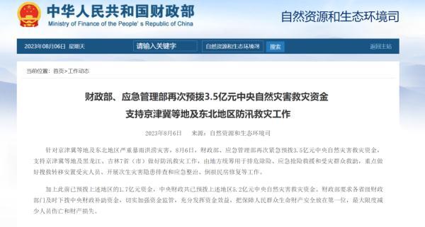 针对京津冀等地及东北地区严重暴雨洪涝灾害,8月6日,财政部、应急管理部再次紧急预拨3.5亿元中央自然灾害救灾资金,支持京津冀等地及黑龙江、吉林7省(市)做好防汛救灾工作,由地方统筹用于排危除险、应急抢险救援和受灾群众救助,重点做好搜救转移安置受灾人员、开展次生灾害隐患排查和应急整治、倒损民房修复等工作。