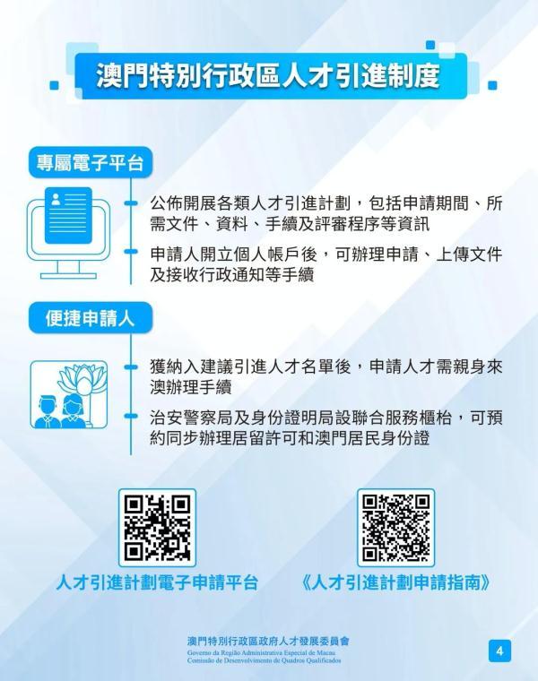 澳门特区政府人才发展委员会发布消息称,人才引进计划电子申请平台已于8月4日开通,并开始接受三类人才引进计划申请。包括高端人才计划、大健康产业优秀人才计划及大健康产业高级专业人才计划。其他重点产业的人才引进计划将于今年第四季陆续公布及开展。