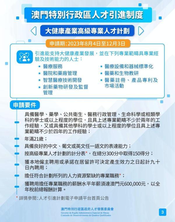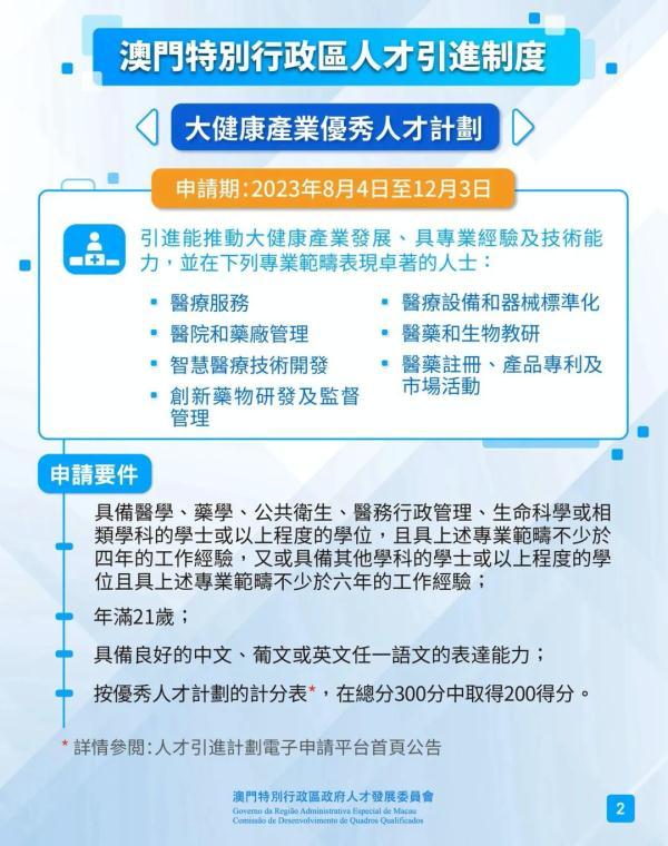大健康产业优秀人才计划和大健康产业高级专业人才计划的申请期为2023年8月4日至12月3日。计划旨在引进能推动大健康产业发展,并在相关专业范畴表现卓著或具专业经验及技术能力的人士。