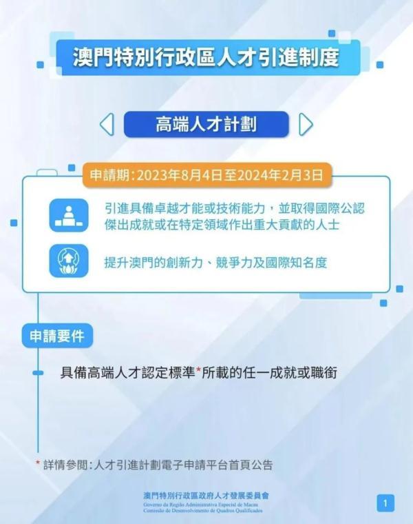 据介绍,高端人才计划的申请期为2023年8月4日至2024年2月3日。计划旨在引进具备卓越才能或技术能力,并取得国际公认杰出成就或在特定领域作出重大贡献的人士,以提升澳门的创新力、竞争力及国际知名度。申请人须具备计划所订的高端人才认定标准所载的任一成就或职衔。