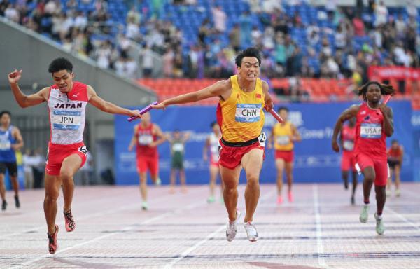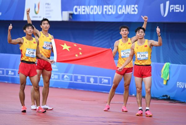 新华社成都8月6日电(记者王沁鸥、罗羽)在6日进行的成都大运会田径项目男子4X100米接力决赛中,由陈佳鹏、陈冠锋、严海滨和邓智舰组成的中国队在雨中以38秒80的成绩夺冠。这一成绩仅比亚军泰国队快了千分之六秒,中国队最后一棒的邓智舰在交接棒明显落后的情况下实现直道逆转。