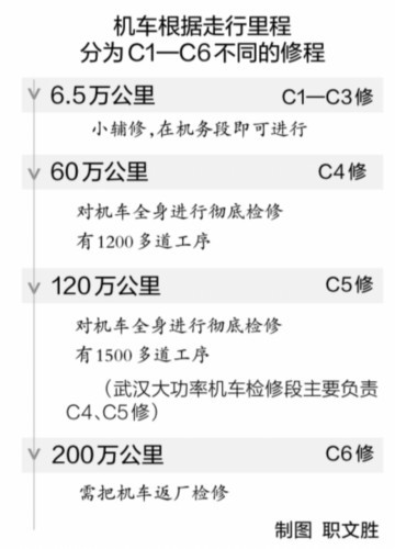 “机车也俗称火车头,这里就是火车头的大型‘4S保养店’。”武汉大功率机车检修段总成车间副主任叶洋告诉长江日报记者,和汽车进“4S店”保养一样,火车头在运行不同里程后也要进行对应的检修作业。根据走行公里分为C1—C6不同的修程,其中C1—C3修为小辅修,在机务段即可进行,而C4、C5修是机车分别运行至60万公里、120万公里后对机车全身进行一次彻底的“内外科大体检”,C6修则需把机车返厂检修。武汉大功率机车检修段主要负责C4、C5修。