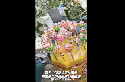 知道冯振生前喜欢吃棒棒糖,两名小朋友特意从家里带来两桶棒棒糖和鲜花一起送到烈士墓前。