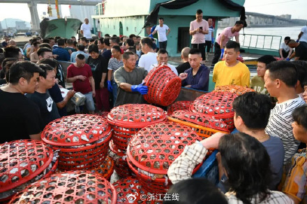 今天凌晨,开捕之后“第一风”透骨新鲜的梭子蟹来了!!!今天6时,浙临渔运12158作业船缓缓靠岸至舟山国际水产城2号码头,这艘渔船共有十余筐梭子蟹,短短几分钟就被各路商贩估价后快速运走。不一会儿,3号码头也迎来了另一艘出捕归来的渔船。这艘渔船出捕的四十余筐梭子蟹以每筐2000元上下的价格快速被商贩收走。据了解,早在靠岸前这两艘渔船的大部分渔货均已被预订包圆。目前梭子蟹的统购价在35-40元/斤,后续随着更多渔船回港,价格也将随之回落。(价格仅供参考)。(舟山发布)