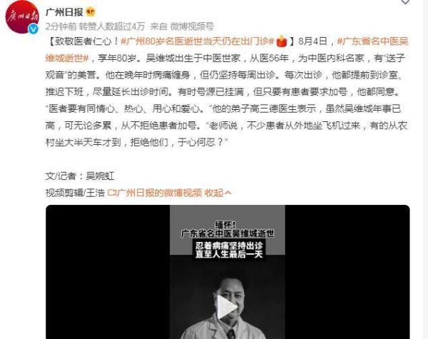 8月4日,广东省名中医吴维城逝世,享年80岁。吴维城出生于中医世家,从医56年,为中医内科名家,有“送子观音”的美誉。他在晚年时病痛缠身,但仍坚持每周出诊。每次出诊,他都提前到诊室、推迟下班,尽量延长出诊时间。有时号源已挂满,但只要有患者要求加号,他都同意。“医者要有同情心、热心、用心和爱心。”他的弟子高三德医生表示,虽然吴维城年事已高,可无论多累,从不拒绝患者加号。“老师说,不少患者从外地坐飞机过来,有的从农村坐大半天车才到,拒绝他们,于心何忍?”