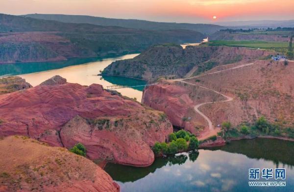 朝霞映照下的靖边县龙洲镇波浪谷丹霞景区(无人机照片)。新华社记者 陶明 摄