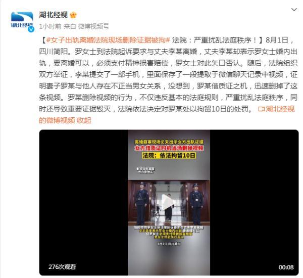 8月1日,四川简阳。罗女士到法院起诉要求与丈夫李某离婚,丈夫李某却表示罗女士婚内出轨,要离婚可以,必须支付精神损害赔偿,罗女士对此矢口否认。随后,法院组织双方举证,李某提交了一部手机,里面保存了一段提取于微信聊天记录中视频,证明妻子罗某与他人存在不正当男女关系,没想到,罗某借质证之机,迅速删掉了这条视频。罗某删除视频的行为,不仅违反基本的法庭规则,严重扰乱法庭秩序,同时还导致重要证据毁灭,法院依法决定对罗某处以拘留10日的处罚。