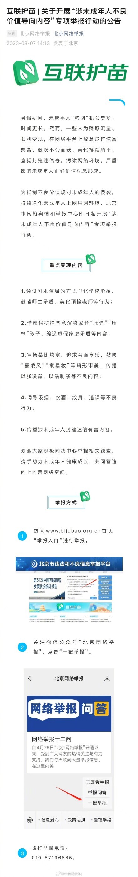 北京市网络舆情和举报中心即日起开展“涉未成年人不良价值导向内容”专项举报行动。重点受理宣扬攀比炫富、追求奢靡享乐,鼓吹“霸凌风”“家暴妆”等畸形审美,诱导吸烟、饮酒、纹身、逃课等内容。举报方式:①访问www.bjjubao.org.cn首页“举报入口”进行举报。②关注微信公众号“北京网络举报”,点击“一键举报”。③举报电话:010-67196565。(北京网络举报)