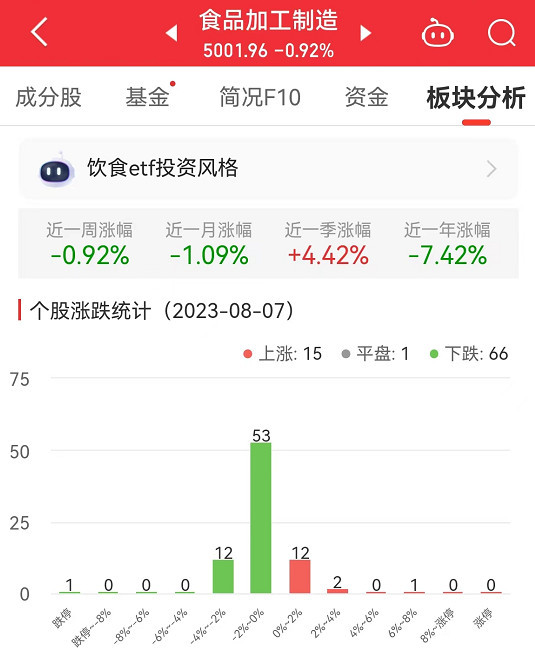 中国经济网北京8月7日讯 今日,食品加工制造板块整体跌幅0.92%,其中,15只股票上涨,1只股票平盘,66只股票下跌。