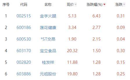 其中,金字火腿、莲花健康、*ST交昂、宝立食品、桂发祥、元祖股份位列板块涨幅前五位,涨幅分别为6.43%、2.77%、2.15%、1.50%、1.28%、1.28%。