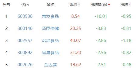 惠发食品、汤臣倍健、洽洽食品、品渥食品、金达威位列涨幅榜后五位,涨幅分别为-10.01%、-3.83%、-2.86%、-2.56%、-2.51%。
