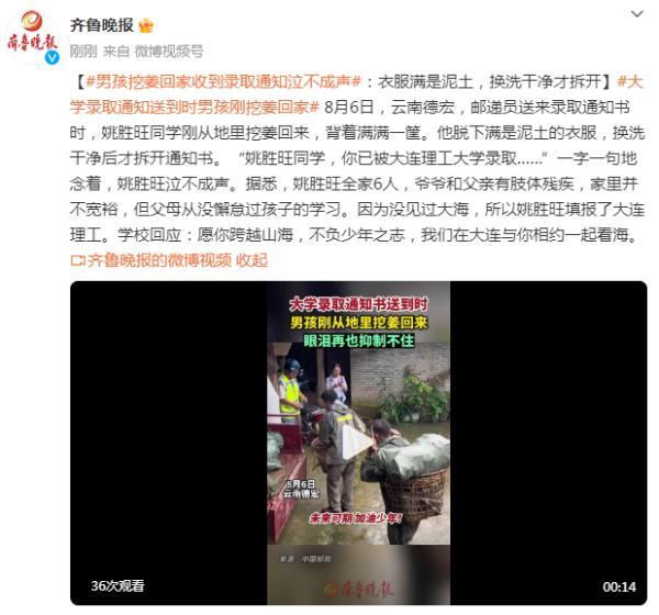 8月6日,云南德宏,邮递员送来录取通知书时,姚胜旺同学刚从地里挖姜回来,背着满满一筐。他脱下满是泥土的衣服,换洗干净后才拆开通知书。“姚胜旺同学,你已被大连理工大学录取……”一字一句地念着,姚胜旺泣不成声。据悉,姚胜旺全家6人,爷爷和父亲有肢体残疾,家里并不宽裕,但父母从没懈怠过孩子的学习。因为没见过大海,所以姚胜旺填报了大连理工。学校回应:愿你跨越山海,不负少年之志,我们在大连与你相约一起看海。