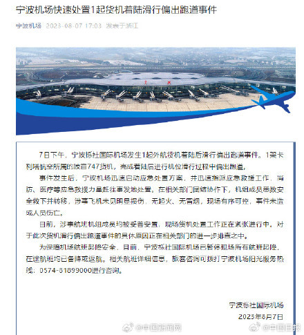 8月7日,宁波栎社国际机场发布通报:7日下午,宁波栎社国际机场发生1起外航货机着陆后滑行偏出跑道事件。1架卡利塔航空所属的波音747货机,完成着陆后进行机位滑行过程中偏出跑道。在相关部门团结协作下,机组成员悉数安全救下并转移,涉事飞机未见明显损伤,无起火、无冒烟,现场有序可控,事件未造成人员伤亡。