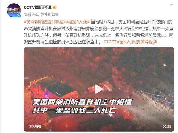 当地时间6日,美国加利福尼亚州消防部门的两架消防直升机在应对该州南部里弗赛德县的一处林火时在空中相撞,其中一架直升机成功迫降,但另一架直升机坠毁,造成机上一名飞行员和两名消防员死亡。两架直升机发生碰撞的具体原因正在调查中。
