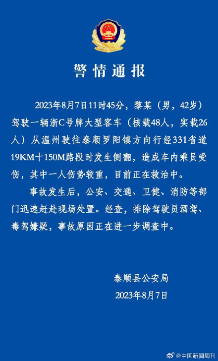据平安泰顺消息:2023年8月7日11时45分,黎某(男,42岁)驾驶一辆浙C号牌大型客车 (核载48人,实载26人)从温州驶往泰顺罗阳镇方向行经331省道19KM+150M路段时发生侧翻,造成车内乘员受伤,其中一人伤势较重,目前正在救治中。