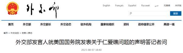 外交部网站7日发表《外交部发言人就美国国务院发表关于仁爱礁问题的声明答记者问》,全文如下: