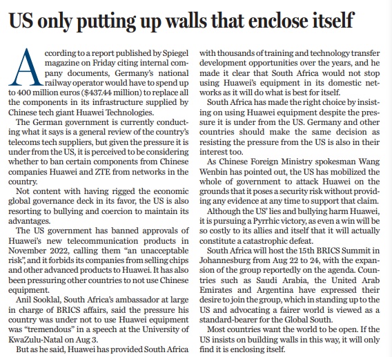 面对来自美国的压力,南非坚持使用华为的设备,这是正确的选择。德国和其他国家应该做出同样明智的决定,抵制来自美国的压力,因为这才符合其本国的利益。