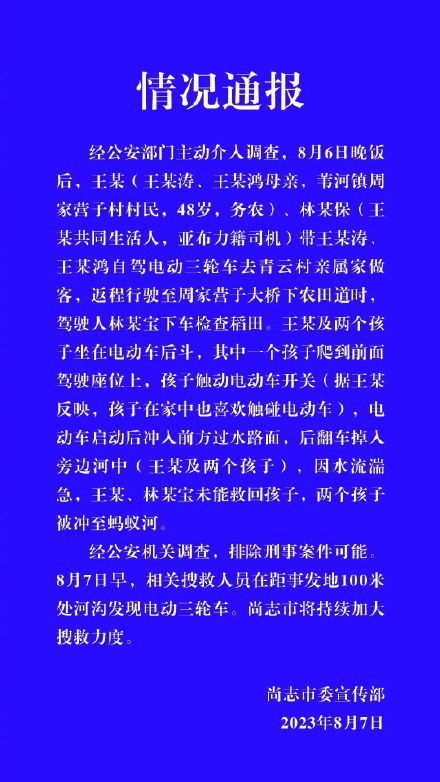 经公安部门主动介入调查,8月6日晚饭后,王某(王某涛、王某鸿母亲,苇河镇周家营子村村民,48岁,务农)、林某保(王某共同生活人,亚布力籍司机)带王某涛、王某鸿自驾电动三轮车去青云村亲属家做客,返程行驶至周家营子大桥下农田道时,驾驶人林某宝下车检查稻田。王某及两个孩子坐在电动车后斗,其中一个孩子爬到前面驾驶座位上,孩子触动电动车开关(据王某反映,孩子在家中也喜欢触碰电动车),电动车启动后冲入前方过水路面,后翻车掉入旁边河中(王某及两个孩子),因水流湍急,王某、林某宝未能救回孩子,两个孩子被冲至蚂蚁河。