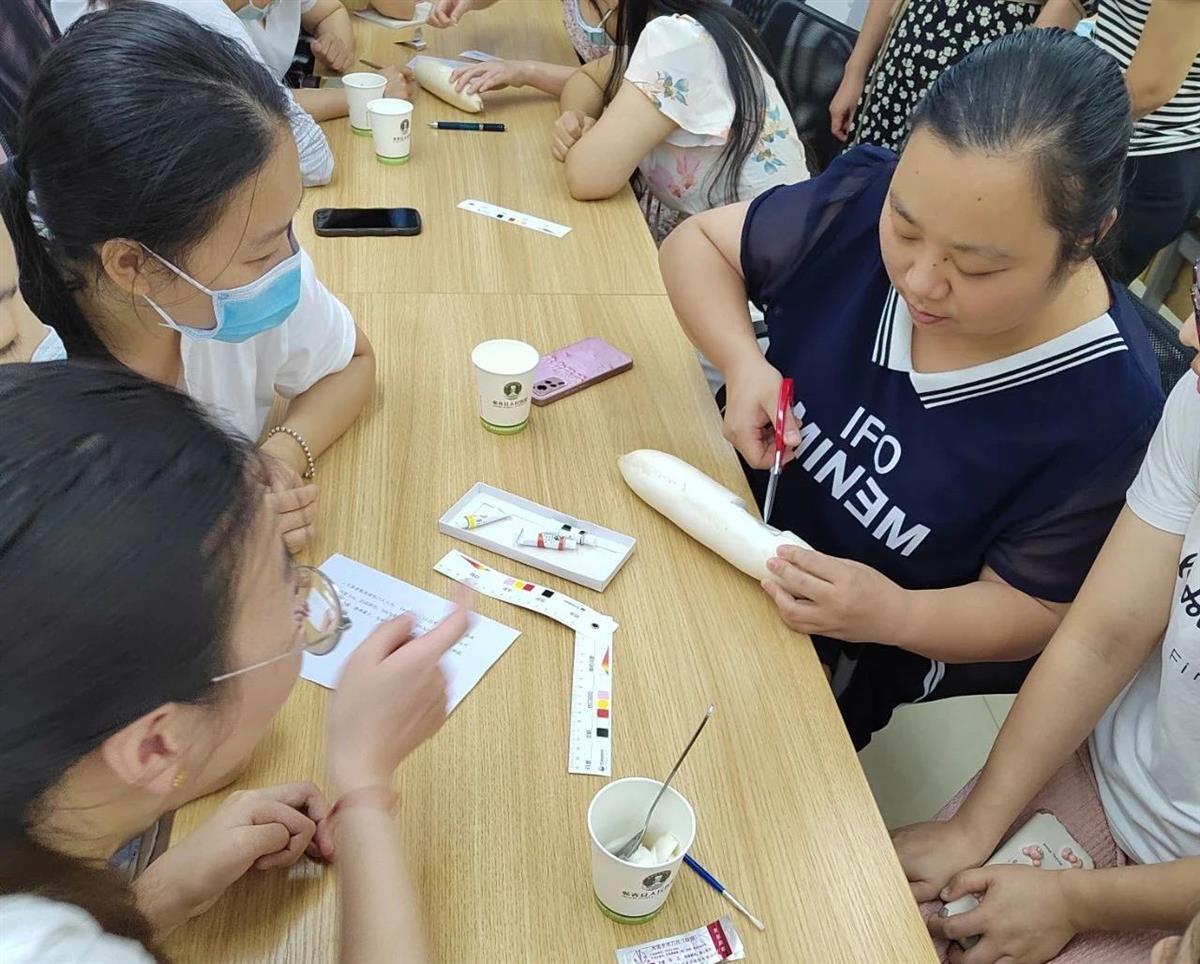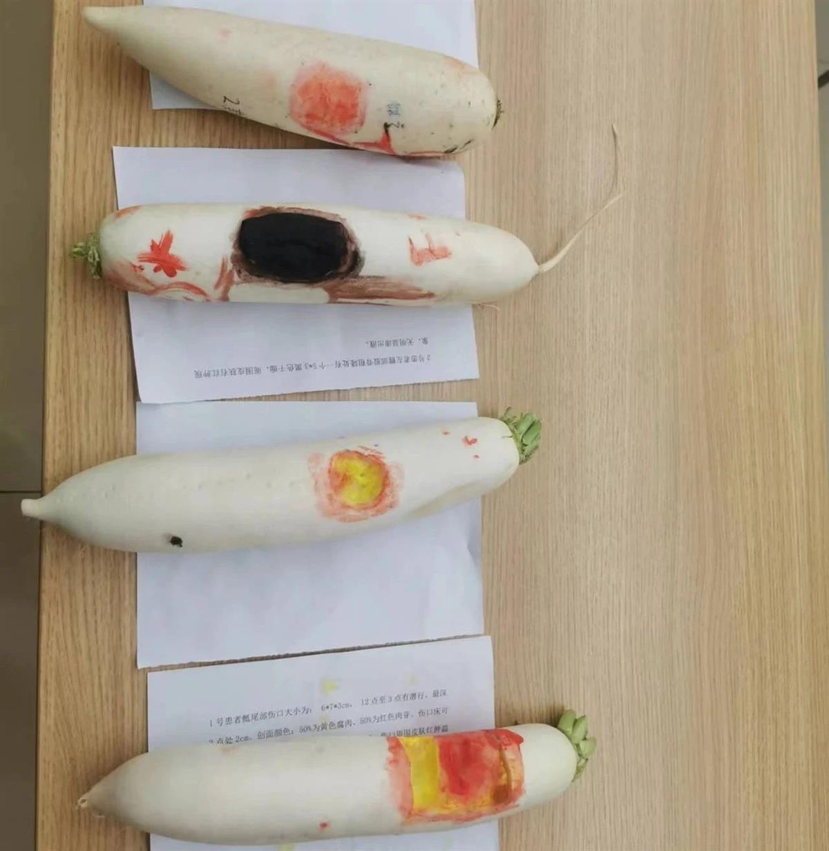 为了强化培训的效果,本次伤口小组培训开启了“工作坊”模式:以萝卜、颜料、画笔等为工具,将到会的人员分为5个小组,各小组成员根据所抽到的病例,在提前准备的实验模型“白萝卜”上模拟出各自的伤口创面,并根据创面情况,为萝卜上色以区别压疮分期,模拟完创面后,再由每一小组探讨出各自的压力性损伤分期,伤口专科护士曹入文老师和汪兰老师分别进行分析指导、共同探讨提高。