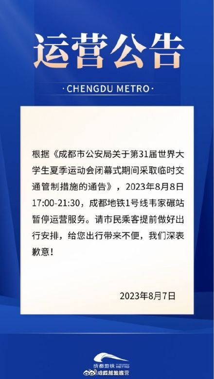 从@成都地铁获悉,根据《成都市公安局关于第31届世界大学生夏季运动会闭幕式期间采取临时交通管制措施的通告》,2023年8月8日17:00-21:30,成都地铁1号线韦家碾站暂停运营服务,请市民乘客提前做好出行安排。