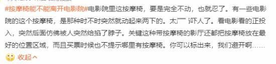 第二,影院方要对按摩椅的安全和质量进行把控,不要消费者坐了按摩椅之后,给按出毛病来,影院方也是要去承担责任的。
