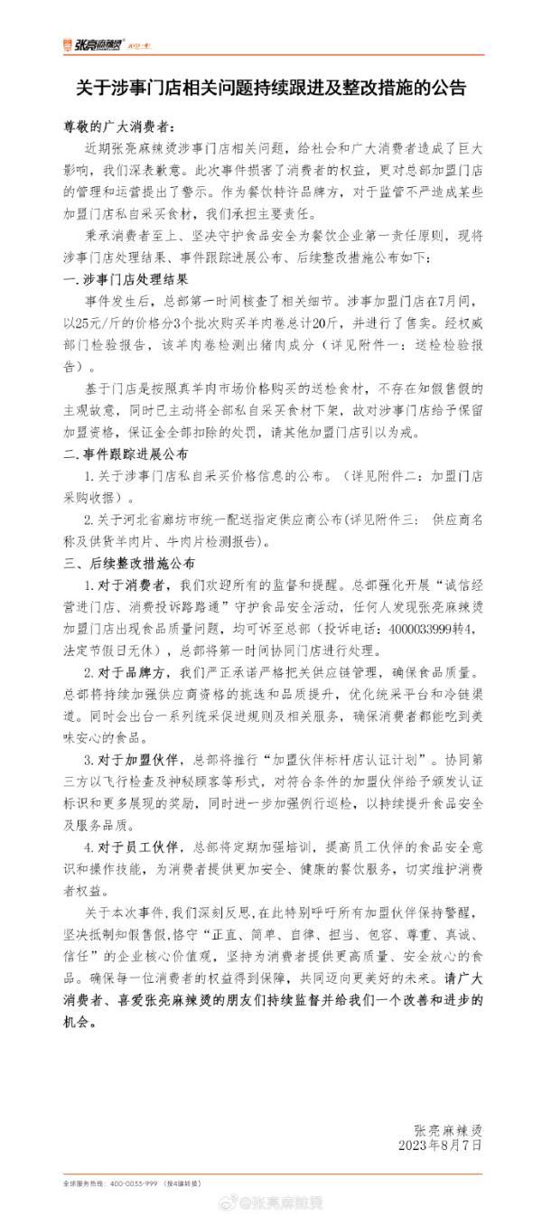 8月7日,张亮麻辣烫官微通报一加盟店羊肉被检出是猪鸭肉一事进展。