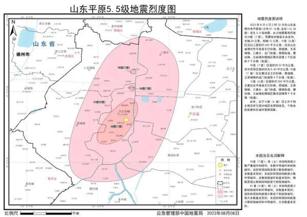 Ⅵ度(6度)区面积约202平方公里,主要涉及平原县王打卦镇、恩城镇、王杲铺镇、三唐乡、龙门街道、桃园街道、腰站镇、王庙镇和德城区黄河涯镇等9个乡镇(街道)。