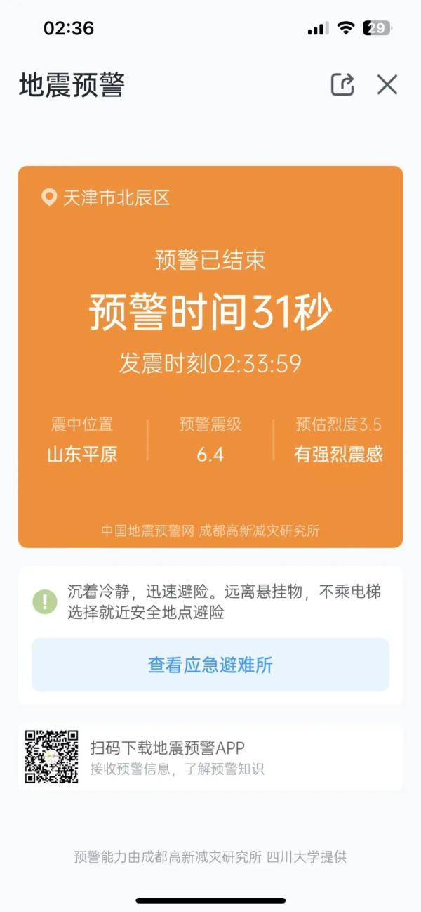 另据了解,今年年底,国家地震烈度速报与预警工程将投入运行,作为该工程“先行先试”试点项目之一,预警工程天津子项目建设目前已基本完成,进入试运行阶段,初步形成地震预警和信息服务能力,可在监测区域内地震发生之后5至8秒发布地震预警信息,5至10分钟产出烈度速报信息。目前,天津地区建有203个预警监测站点,平均台站间距约7.7千米。
