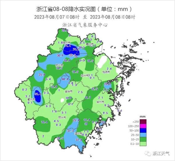 7日08时至8日08时全省面雨量15毫米,地市较大的有温州23毫米、嘉兴22毫米、杭州19毫米;有121个乡镇(街道)累计雨量超过50毫米,其中10个超过100毫米,单站最大为苍南桥墩镇122毫米;35个乡镇(街道)小时雨强超过50毫米,单站最大为泰顺彭溪联山101毫米;全省共有103个乡镇(街道)出现8级以上大风,最大为泰顺县泗溪横坑上宅26.2米/秒(10级)。