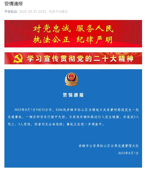 据“平安松山”微信公众号消息:2023年8月7日9时22分许,S206线赤峰市松山区当铺地乡关家营村路段发生一起交通事故,一辆自卸货车行驶中失控,与其他车辆和路边行人发生碰撞,共造成3人死亡、3人受伤,伤者均无生命危险;事故正在进一步调查中。