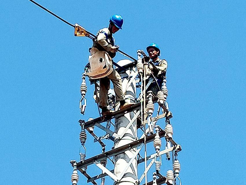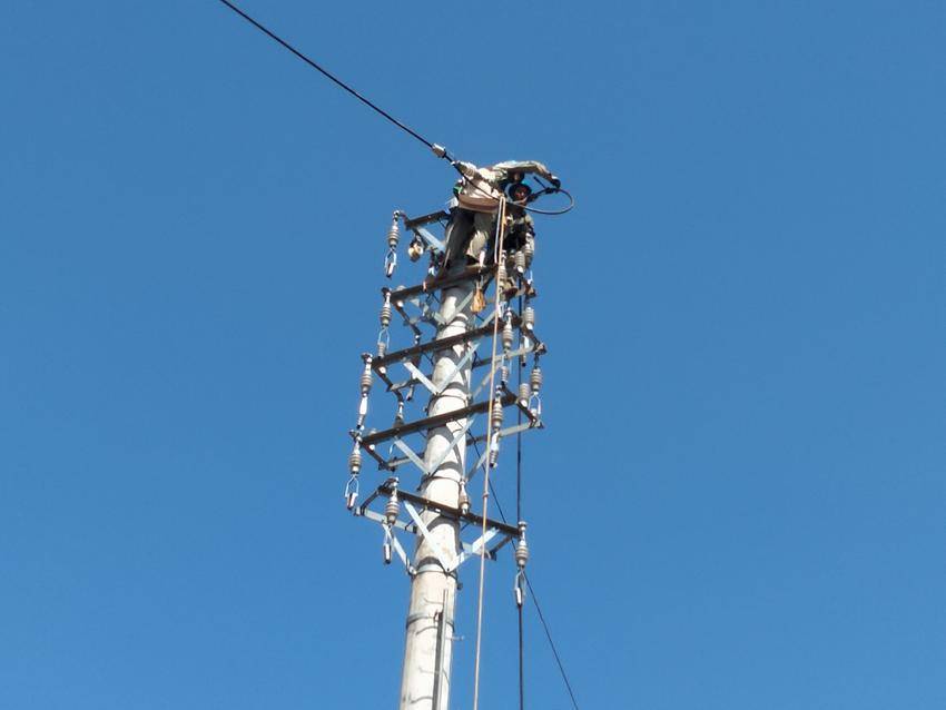 施工当天,天气温度达到37摄氏度,烈日炎炎、酷暑难耐。该公司各级管理人员严格履行到岗到位职责,全面管控现场施工安全及施工质量,登塔员工按照工作方案要求,认真检查登高工器具、穿戴好全套防护装备,地面配合人员打好临时拉线、整理好架空导线及所属金具、材料,在塔上塔下人员的通力配合下,截止上午11时35分,10千伏辉煌一、二回线16号至19号杆导线展放第一阶段工作任务全部完成。