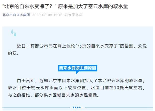 北京市自来水集团通过微信公众号解释自来水变凉主要原因:
