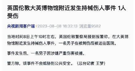 当地时间8日上午10时左右,英国伦敦警察局接到报警称,在大英博物馆附近发生持械伤人事件,一名男子在被刺伤后被送往医院。事件发生后,一名男子因涉嫌严重伤害被捕。 警方称,该事件不会威胁到公共安全。(央视新闻客户端)