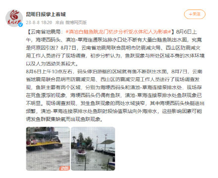 8月6日上午10点左右,码头停泊游艇的区域就有鱼不断跃出水面。8月7日,云南省地震局联合昆明市防震减灾局、西山区防震减灾局工作人员进行了现场调查发现,鱼跃主要有两个区域,分别为海埂西码头和滇池-草海连接泵排水处,现场存在死鱼漂浮的现象,海埂西码头仍偶有鱼跃,滇池-草海连接泵排水处鱼跃现象已不明显。现场调查发现,发生鱼跃现象的两处水域狭窄,其中海埂西码头快艇进出频繁,滇池-草海连接泵排水处鱼跃时段恰值泵站向外海排水,这些影响因素可能诱发鱼群聚集缺氧而出现鱼跃现象。