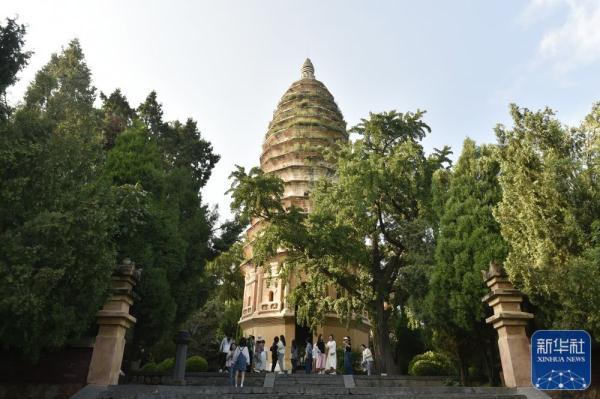 ↑8月7日,参加集体采访活动的媒体记者参观河南登封“天地之中”历史建筑群中的嵩岳寺塔。