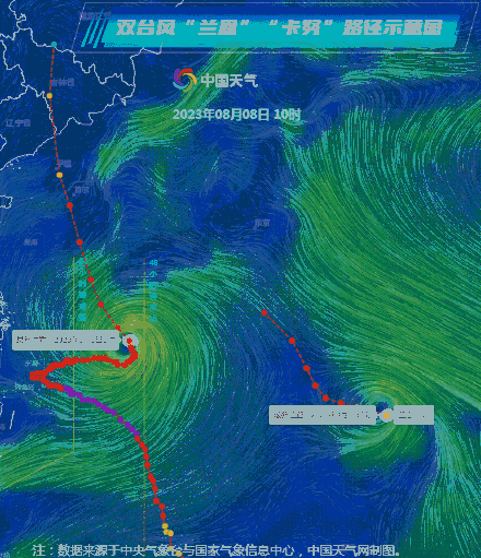 目前今年第5号台风“卡努”和第6号台风“兰恩”正在海洋上共存,从图二路径风场图上也能看到“兰恩”北侧有条偏东气流的水汽通道,对“卡努”有一定的水汽输送支持作用,这也是“卡努”明天强度会小幅增强的一个辅助因素。