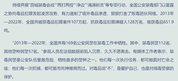“2013年—2022年,全国共有169名公安民警在禁毒工作中牺牲。其中,禁毒民警112名,其他警种民警57名。”