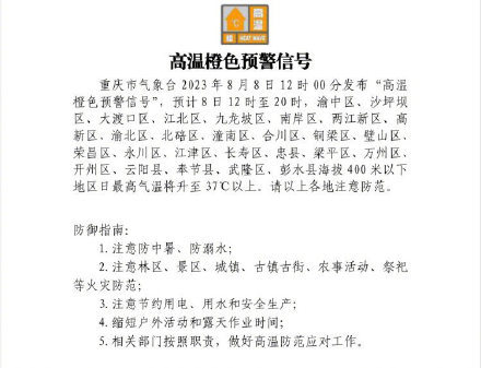 8月8日12时00分,重庆连续第三天发布“高温橙色预警信号”。预计8日12时至20时,渝中区、沙坪坝区、大渡口区、江北区、九龙坡区、南岸区、两江新区、高新区、渝北区、北碚区、潼南区、合川区、铜梁区、璧山区、荣昌区、永川区、江津区、长寿区、忠县、梁平区、万州区、开州区、云阳县、奉节县、武隆区、彭水县海拔400米以下地区日最高气温将升至37°C以上。请以上各地注意防范。(上游新闻记者石亨)