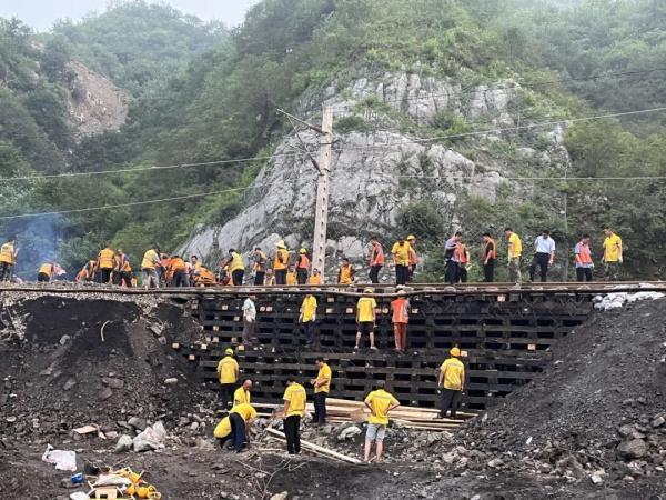 受台风“杜苏芮”带来的极端强降雨影响,丰沙铁路部分线路受损严重。其中,3号至4号隧道区间线路中断,近60米轨道下方路基被冲垮,轨排距地面悬空10多米。铁路部门紧急组织北京工电大修段、北京西工务段、北京供电段、北京西车务段、北京通信段等单位,调集枕木、石砟等物资,第一时间进山抢修。