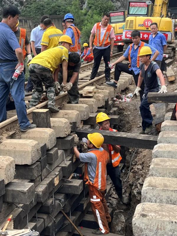 据该段施工四队班组长王树直介绍,他们原本在唐山附近进行户外施工作业,接到抢险任务后,立即从唐山赶到这里,清理碎石泥沙,搭枕木垛,为线路铺通打好“地基”。