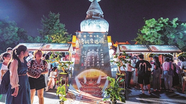 此外,“诗词奇遇夜”还分别在诗碑廊旁和主楼广场瞰川亭处打造时空驿站,在胜像宝塔旁设置DIY诗词市集,多种互动内容将盛唐诗意生活的氛围感拉满。在瞰川亭的发光诗词打卡点前,身着古装的游人相约自拍,宛如电影中诗酒相酬的文人墨客,让夜色中的黄鹤楼也仿佛回到了盛唐的灯火里。穿着汉服的“小李白”“小杜甫”穿梭在时空驿站,与现场游客对诗互动、欢乐合影,只要能展示诗词相关的才艺,就能获得诗词明信片、团扇等好礼。在DIY诗词市集,游客们还用诗词DIY小物件,制作属于自己的诗词团扇或明信片。