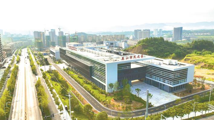英山县新政务服务中心地处城区和谐大道与红山大道交会处,占地60亩,项目投资2.2亿元,总建筑面积3.5万平方米,楼顶“英山市民之家”6个大字格外醒目。