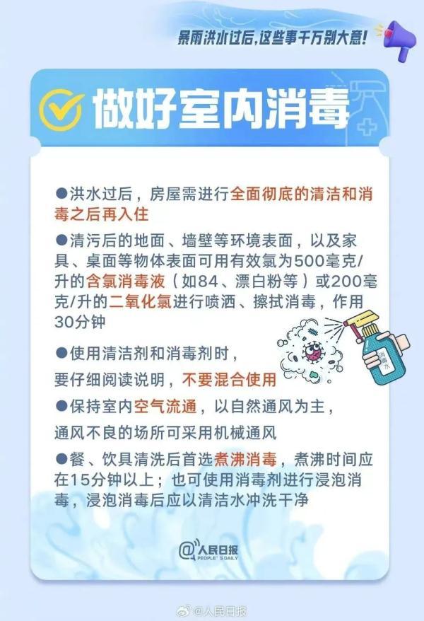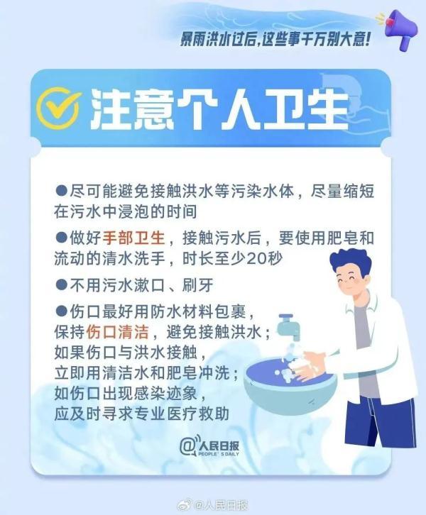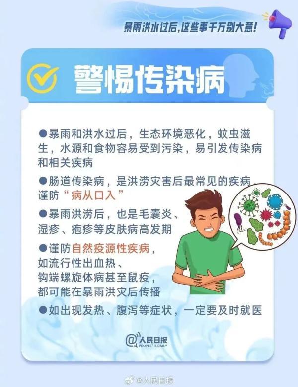 暴雨洪水除了带来泥石流、滑坡等灾害,还会污染水源和引发传染病疫情,即使暴雨和洪水退去也不可掉以轻心。