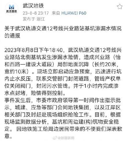 当晚,武汉地铁官方微博发布通报,称工地因渗漏水出现局部沉降,后经检测,周边建筑物安全稳定。