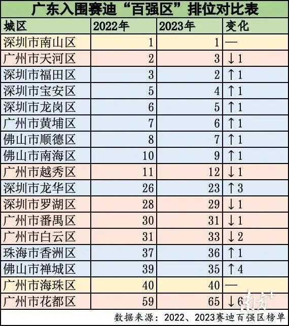 与去年相比,禅城区上升4名,速度最快,龙华区上升3名;福田区、宝安区、龙岗区、黄埔区、顺德区、南海区、香洲区7个区均上升1个位次。